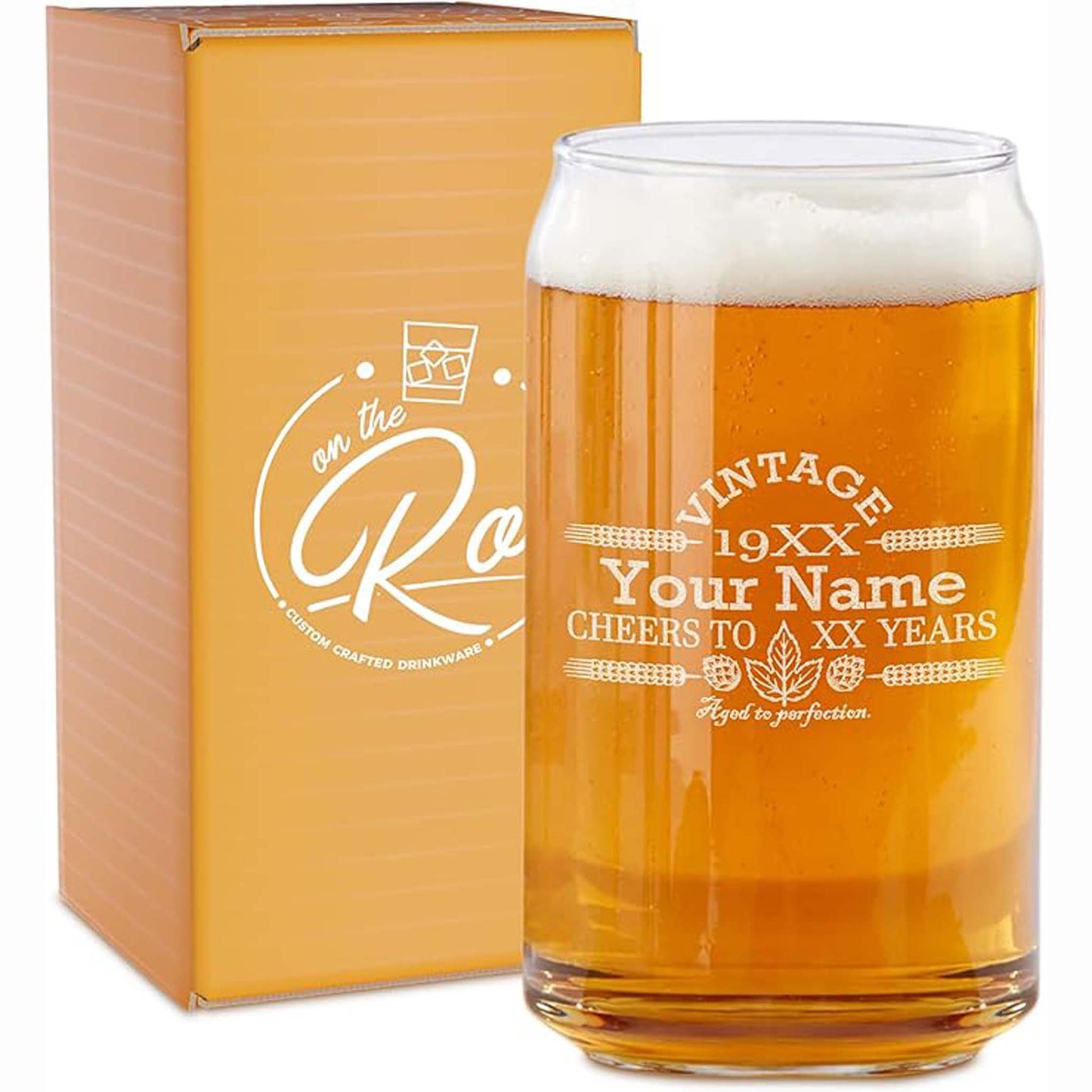 On The Rox Drinks Customized Birthday Beer Glass. Engraved and personalized with name, birth year, and age. Vintage style.